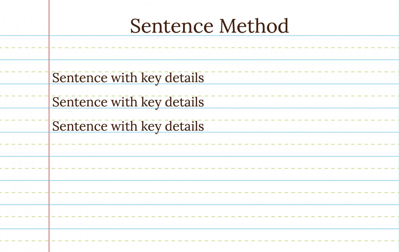 Bạn chỉ có thể giữ lại nhiều thông tin như vậy khi một chủ đề hoàn toàn mới hoặc bạn đang tìm hiểu rất nhiều chi tiết. Ngay cả những chi tiết thực sự quan trọng cũng có thể bị bỏ sót nếu bạn tiếp thu quá nhiều. Mặc dù phương pháp này có vẻ không có tổ chức, nhưng mục tiêu ở đây là thu thập càng nhiều thông tin càng tốt để bạn có thể tổ chức nó sau này. Đây là phương pháp ghi chú hiệu quả ở mặt chi tiết hơn là ý tưởng lớn.